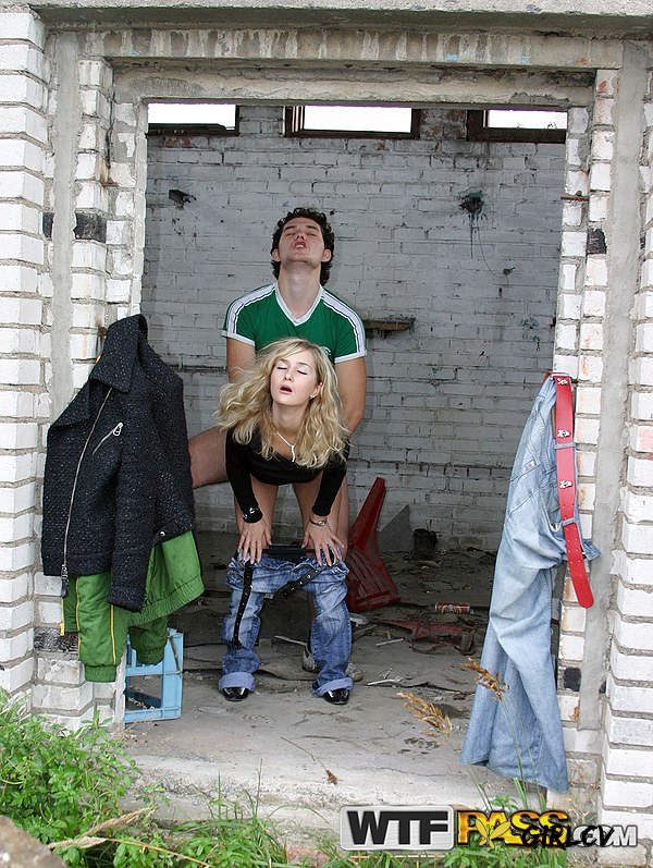 blonde girl does hardcore anal in an abandoned building with strangers